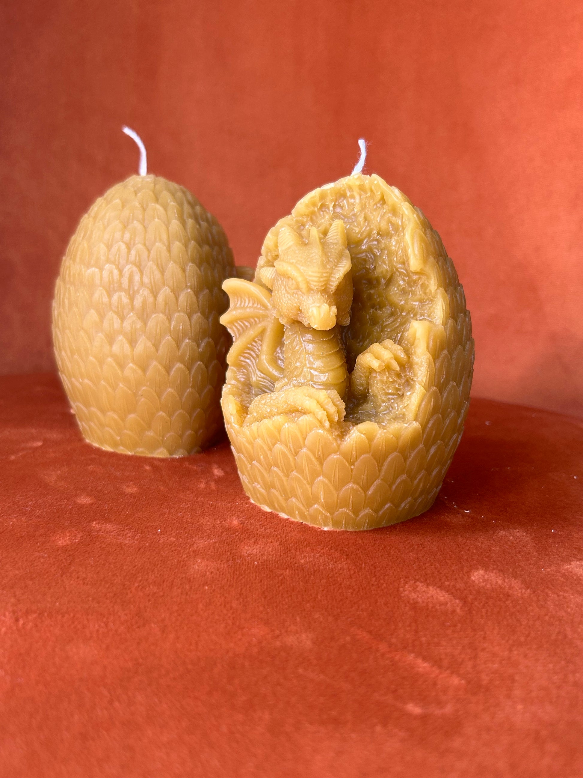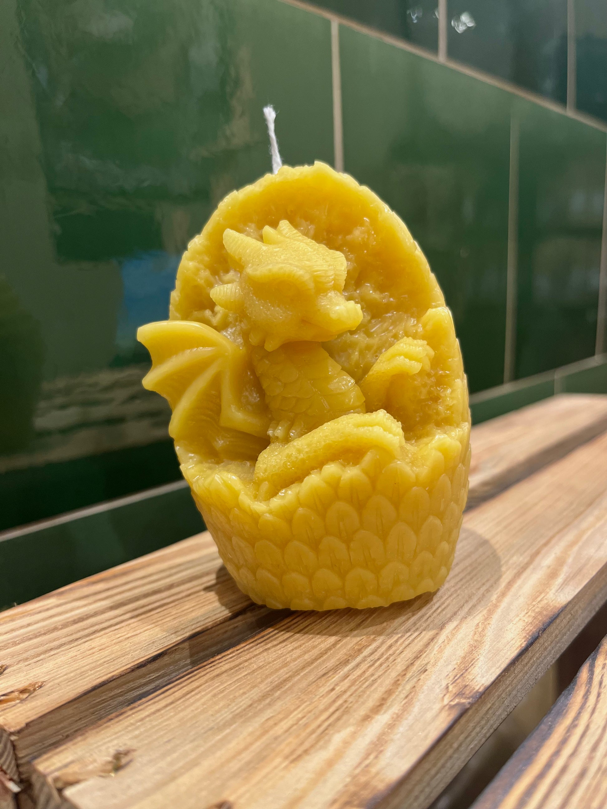 Naturfarbene Drachen - Kerze aus echtem deutschen Bienenwachs in toller 3D Optik. Der kleine Drache schlüpft aus seinem Ei. Die warm-gelbe Farbe ist die natürliche Farbe des Wachses. Die Kerze ist von Hand gegossen und frei von zusätzlichen Inhaltsstoffen. Ein wunderschönes Produkt unserer Natur mit angenehmen Duft. 🌱🐝🕯️