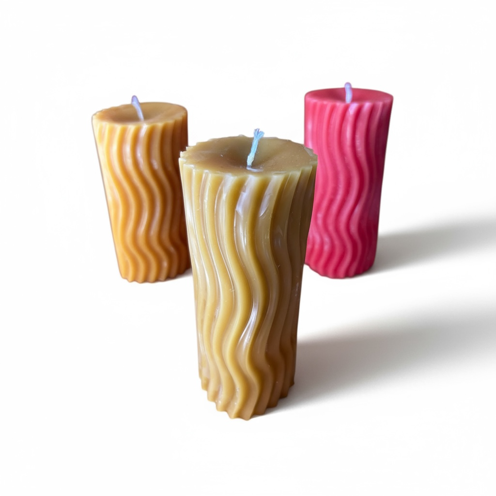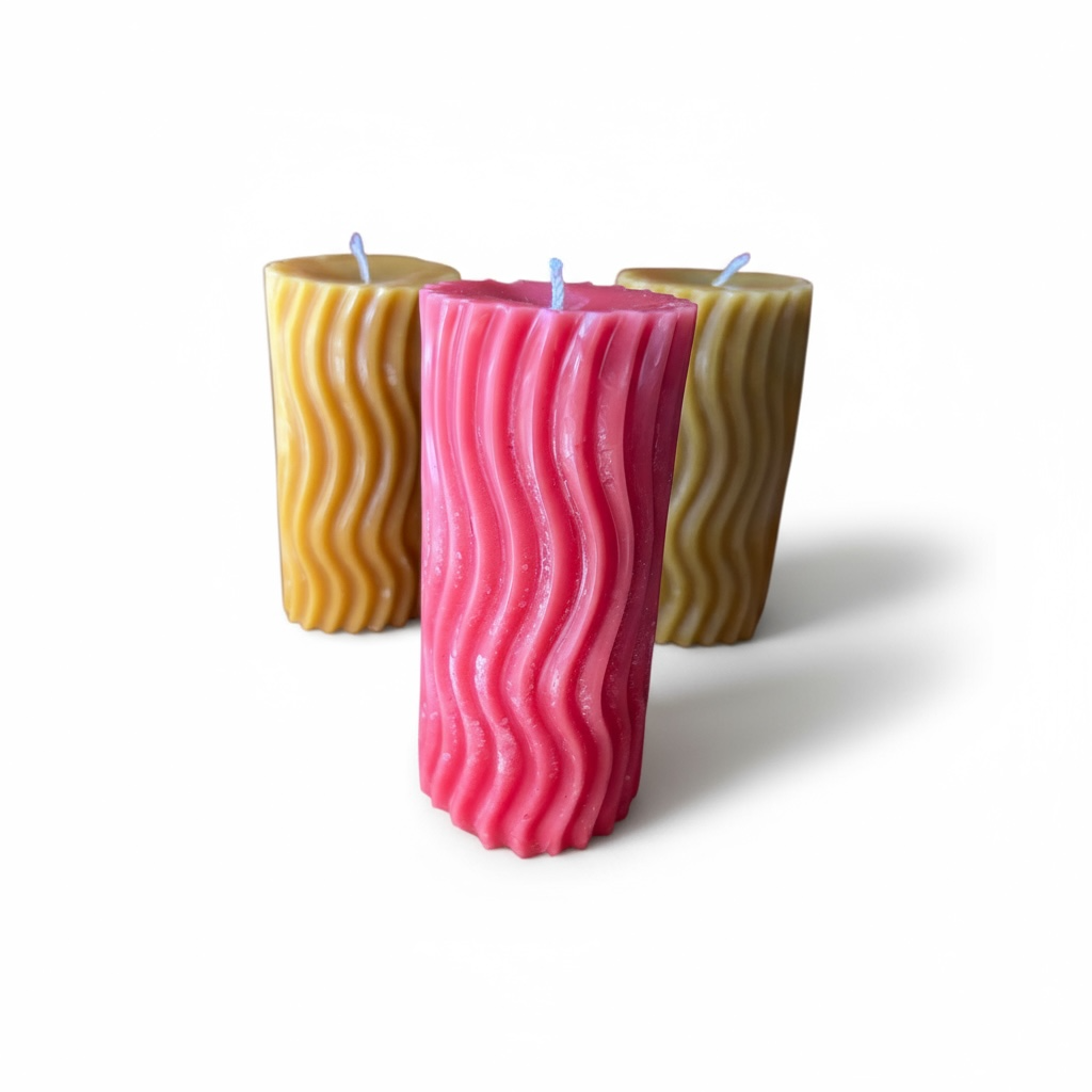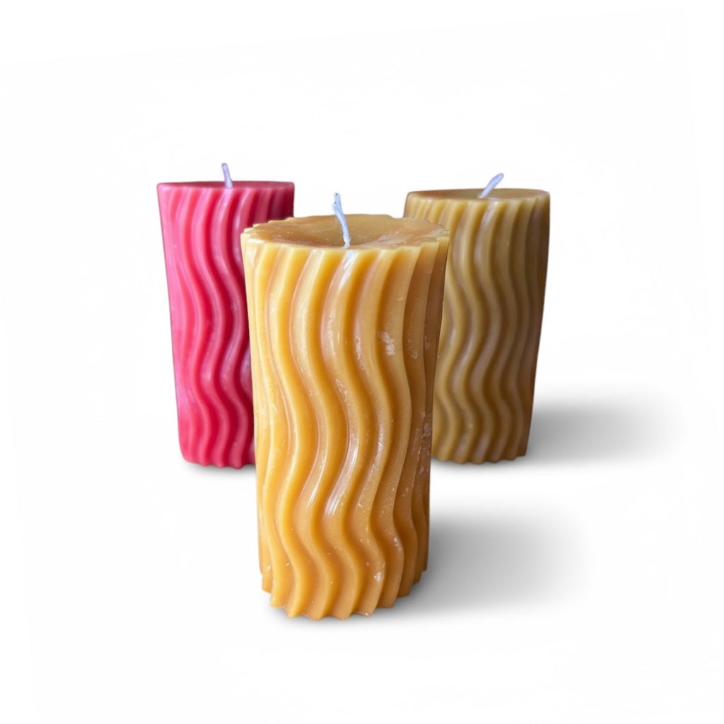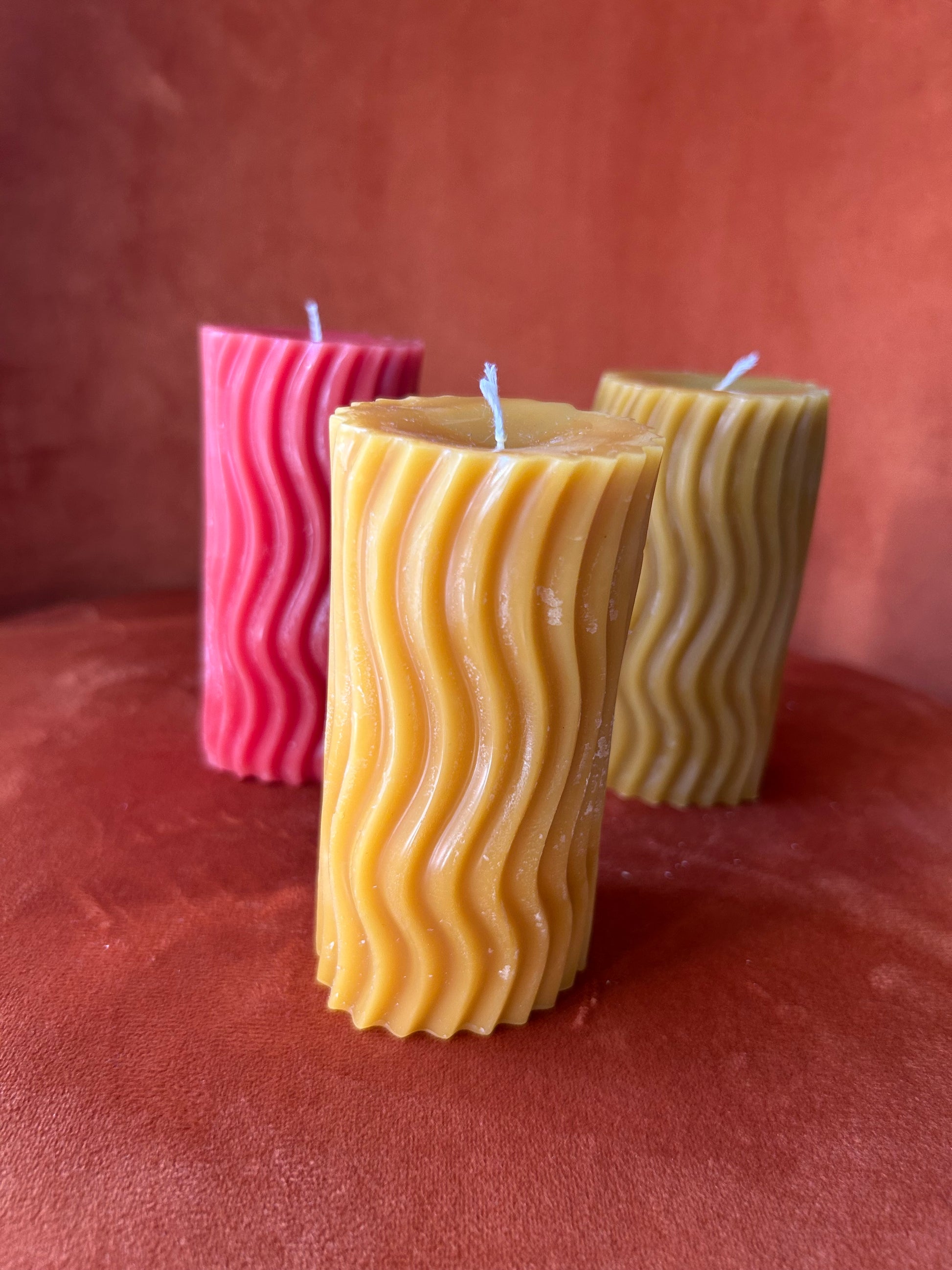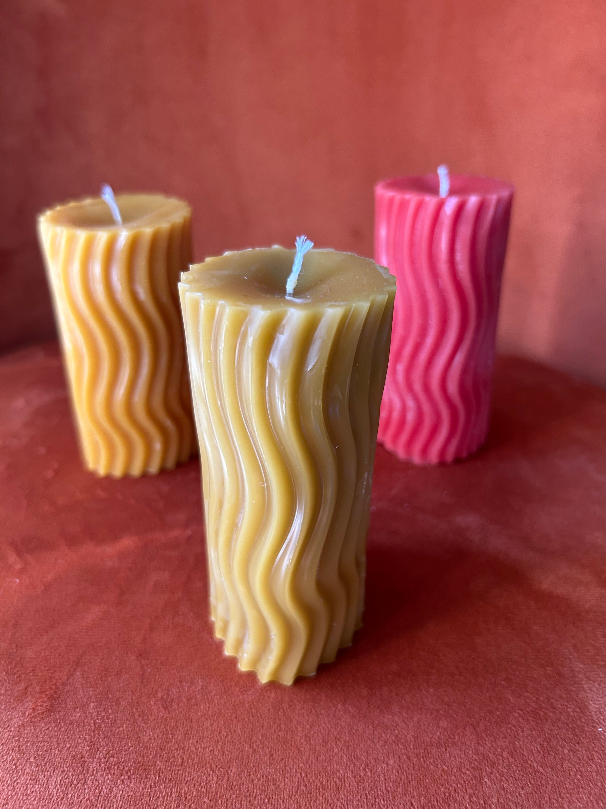 Naturfarbene leicht ovale, gewellte Kerze aus echtem deutschen Bienenwachs in toller 3D Optik. Die warm-gelbe Farbe ist die natürliche Farbe des Wachses. Die Kerze ist von Hand gegossen und frei von zusätzlichen Inhaltsstoffen. Ein wunderschönes Produkt unserer Natur mit angenehmen Duft. 🌱🐝🕯️