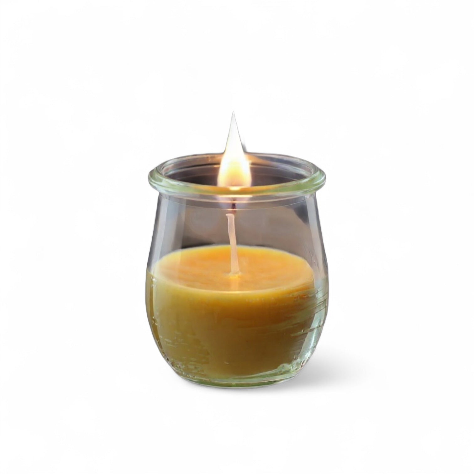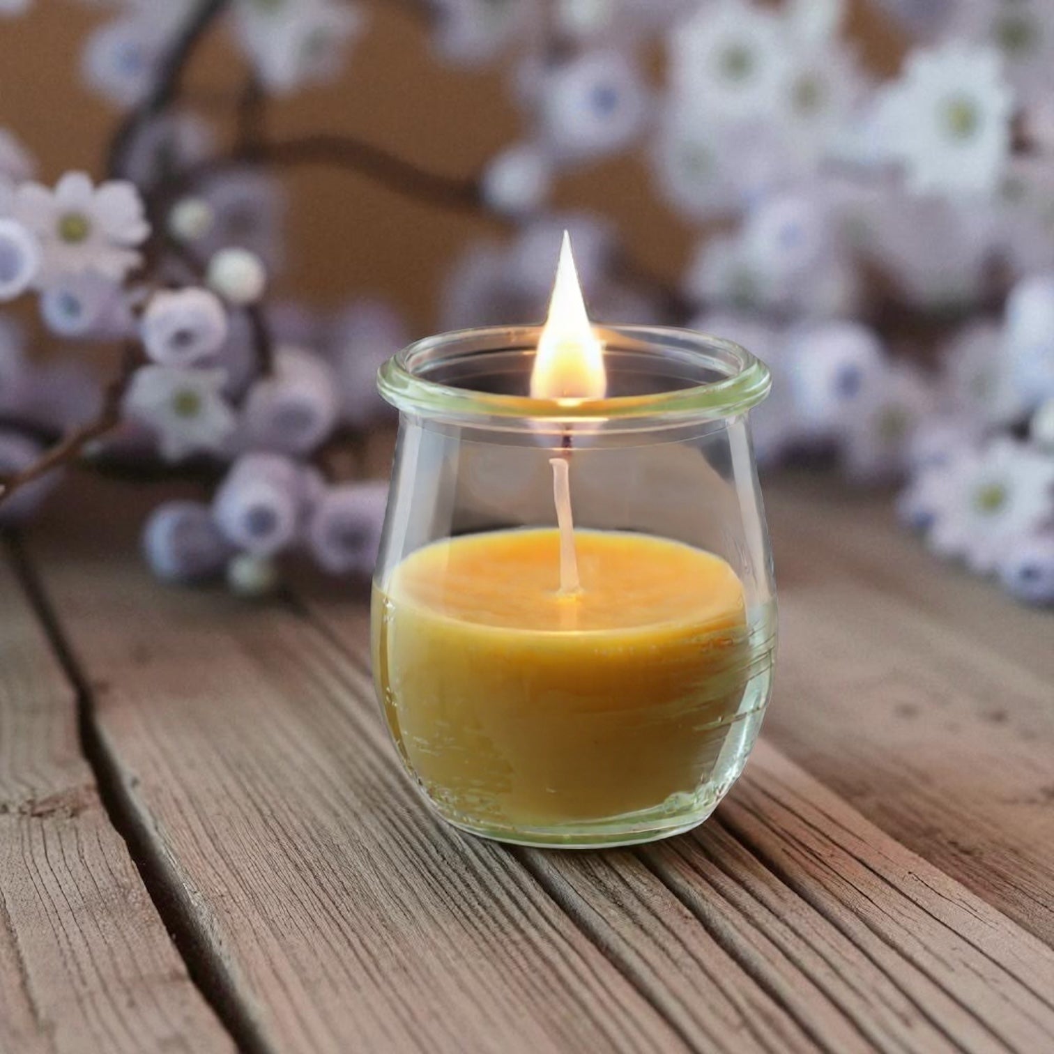Unsere naturfarbenen Kerzen im WECK-Tulpenglas aus hochwertigem deutschen Bienenwachs sind einzigartige, handgefertigte Produkte aus eigener Imkerei. Das warme, gelbliche Licht dieser Kerze stammt ganz natürlich aus dem Bienenwachs, ohne dass zusätzliche Farbstoffe oder Inhaltsstoffe hinzugefügt werden.